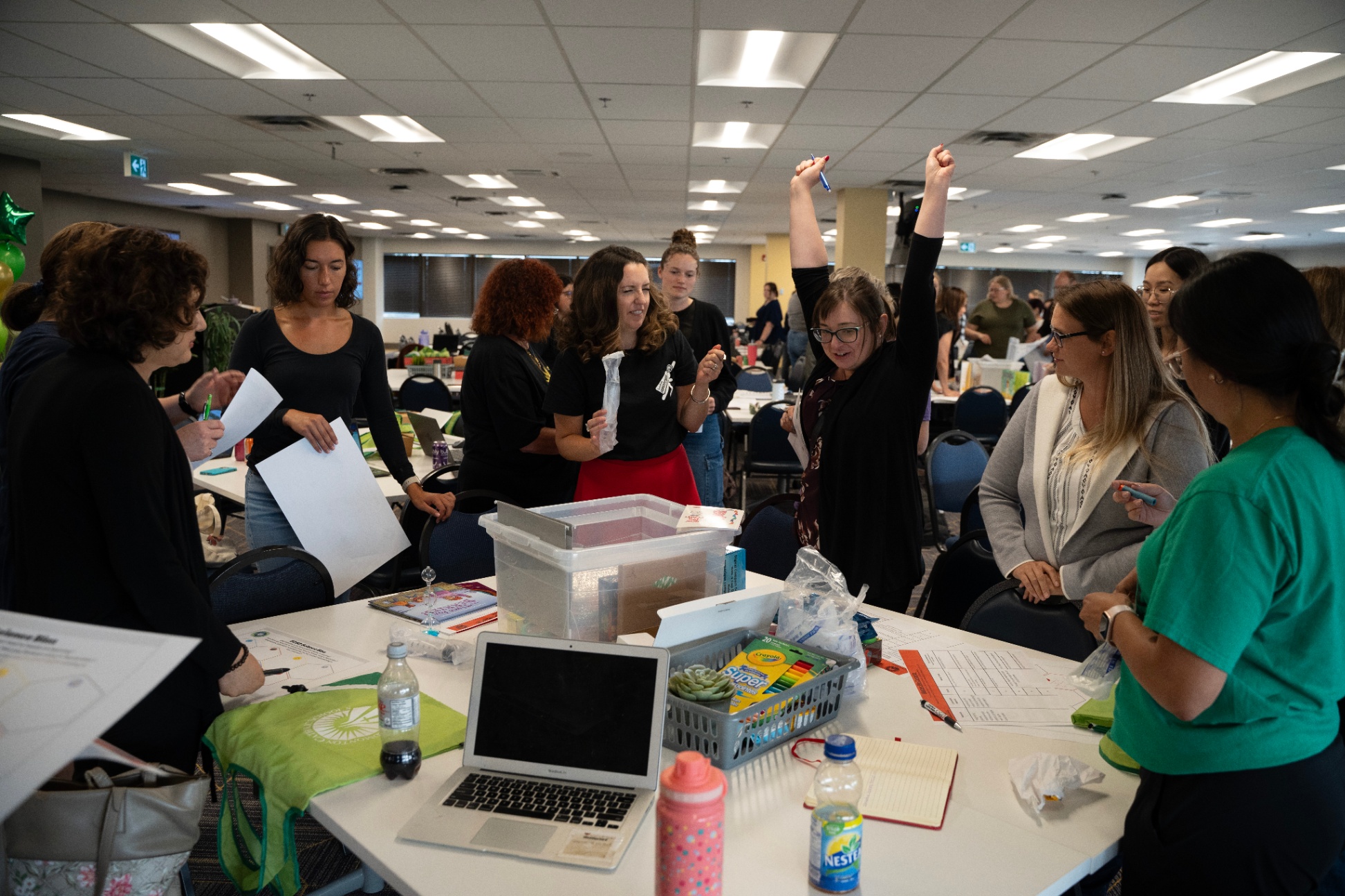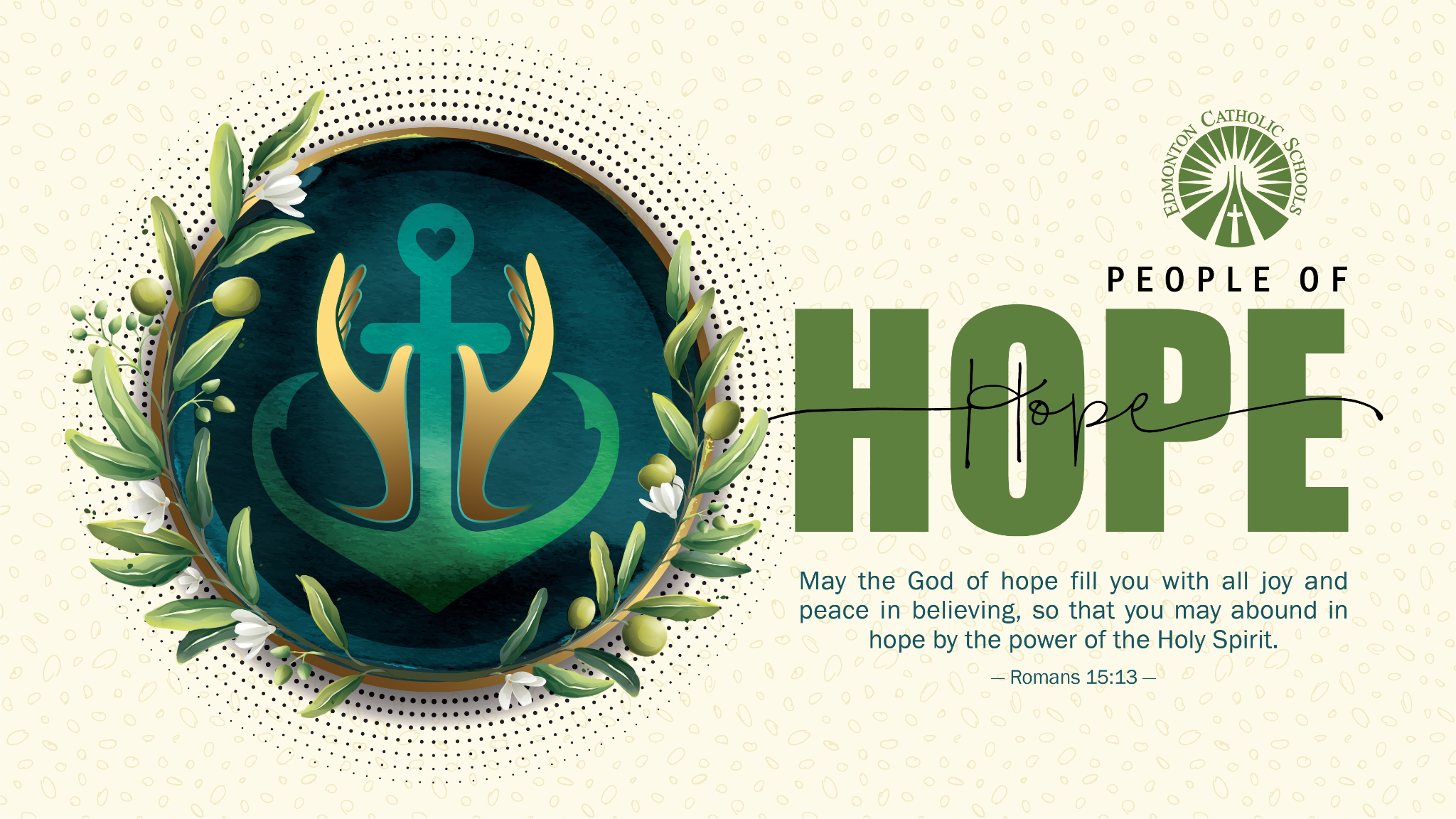 We emphasized green because it is the colour of springtime, growth, and renewal – which is fitting for our theme of hope. The graphic integrates traditional symbols for faith, hope, and love – which are the cross, anchor, and heart respectively. The hands represent our ECSD community reaching towards love, cradling hope, and raised in praise. The graphic is then surrounded by olive branches as a symbol of peace and goodwill.