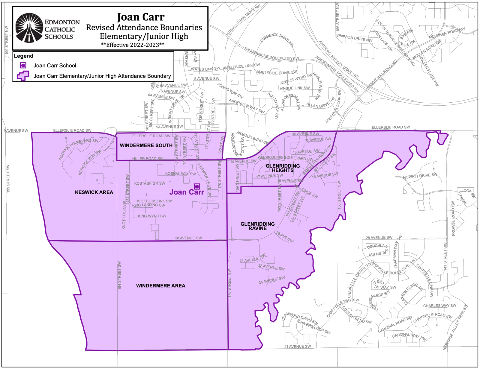 - All Kindergarten to Grade 7 students choosing to enroll in the regular program residing in the outlined Joan Carr Catholic Elementary/Junior High School attendance boundary will be designated to Joan Carr Catholic Elementary/Junior High School, effective September 2022.