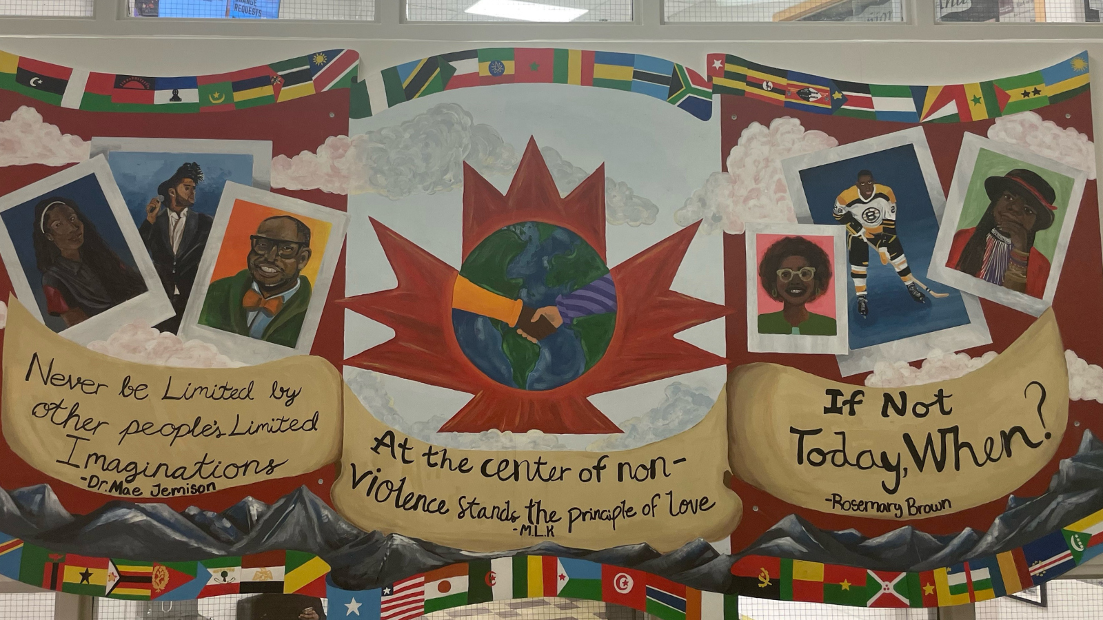 Students at Austin O’Brien Catholic High School created this mural to hang in their school. The lead artist, Daniela D, shares, “I wanted to capture the diversity that exists in Canada and did so by including Black community figures from different backgrounds. We have musical artist the Weeknd, an author, an athlete, and many others who capture the success of the community.”