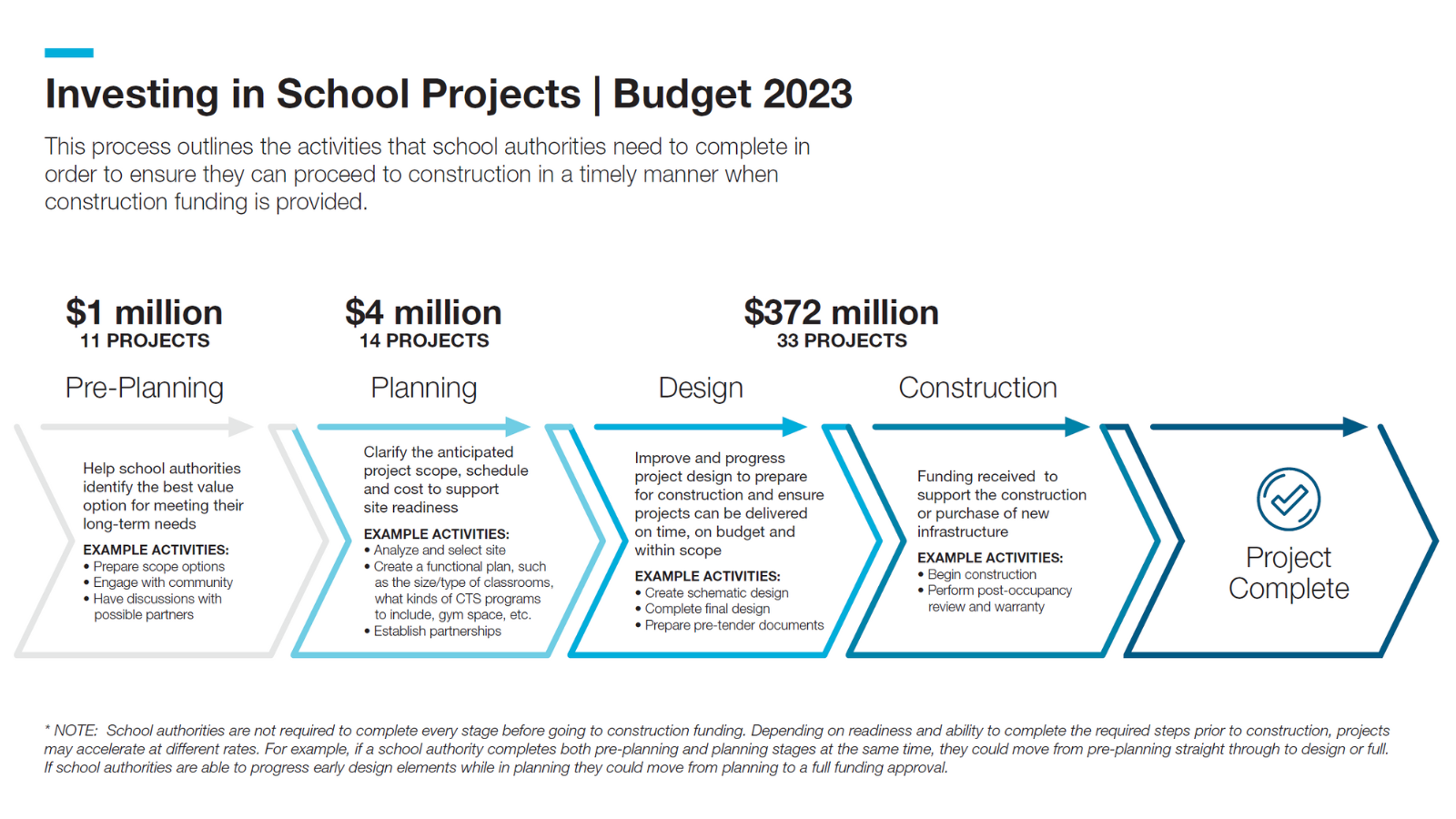As part of Budget 2023, the Alberta Government introduced a new way of funding school projects, adding support for planning and pre-planning. Two of our capital priorities (Heritage Valley/Cavanagh and North Edmonton/Crystallina Nera East) are listed for planning or pre-planning.